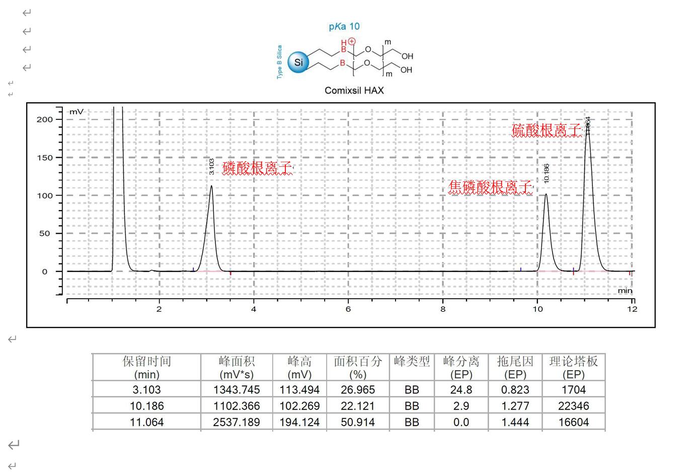 方法說明:通過 Comixsil HAX 的中等強(qiáng)度的陰離子交換能力保留各陰離子,通過酸的濃度調(diào)節(jié)各陰離子的保留,解決了在其他固定相上比較難解決的焦磷酸根離子的保留和峰形問題。Comixsil HAX 在高比例有機(jī)相條件下也存在強(qiáng)的 HILIC 作用,在本應(yīng)用中,為了避免過強(qiáng)的保留,只發(fā)揮其陰離子交換的作用。