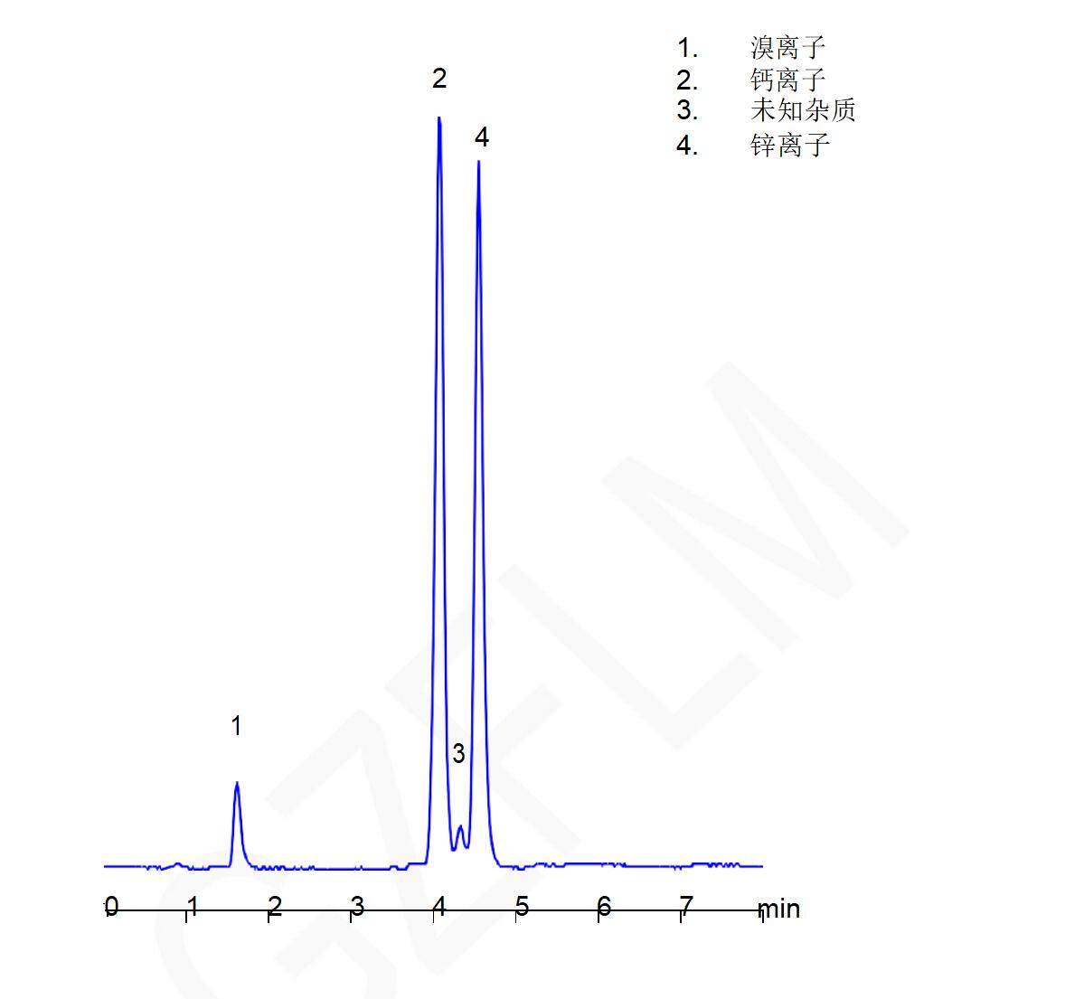 說明:若用此法測定鈣離子時,樣品中需避免存在氯離子,在Comixsil HAC固定相色譜柱中,鈣離子與氯離子將共洗脫。 如果是氯離子存在時的鈣離子的分析,可以采用Comixsil ACRP或Comixsil RP-100等其它固定相色譜柱進行分析。