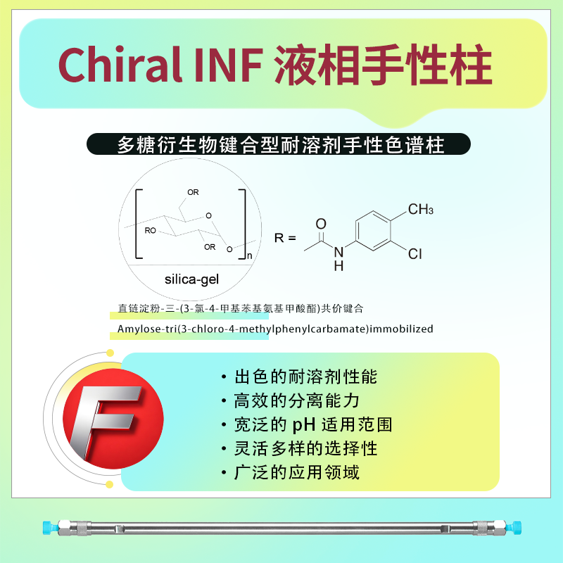 Chiral INF 鍵合型耐溶劑手性柱的固定相為直鏈淀粉-三-(3-氯-4-甲基苯基氨基甲酸酯)共價(jià)鍵合,Amylose-tri(3-chloro-4-methylphenyl